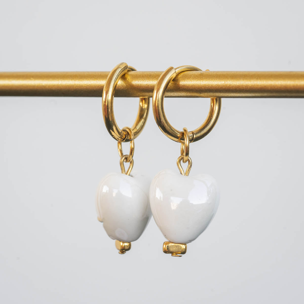 Orecchini a cerchio con pendente a forma di cuore in ceramica.
